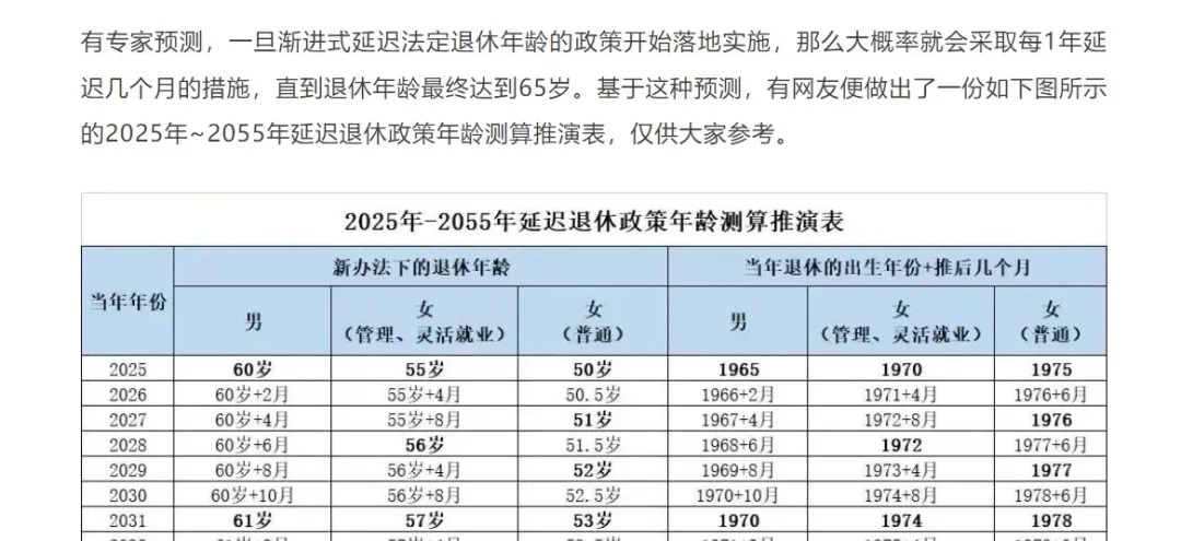 根据上述自媒体公众号文章介绍,这一结论来自于一张《退休年龄对照表及相关规定》和《2025年-2055年延迟退休政策年龄测算推演表》。那么这个表有官方依据吗?