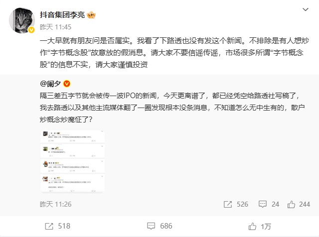 针对“字节跳动准备在中国香港上市”的传闻,抖音集团副总裁李亮25日在微博回应称:一大早就有朋友问,不排除有人想炒作“字节概念股”而故意放的假消息。请大家不要信谣传谣,市场很多所谓“字节概念股”的信息不实,请大家谨慎投资。