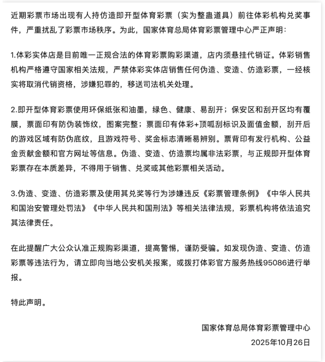 10月26日,国家体育总局体育彩票管理中心发布声明表示,近期彩票市场出现有人持仿造即开型体育彩票(实为整蛊道具)前往体彩机构兑奖事件,严重扰乱了彩票市场秩序。