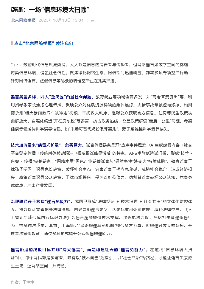 作品简介:文章聚焦数智时代网络谣言问题,探讨治理路径,构建社会“谣言免疫力”,净化网络空间。文章指出我国已形成“法律规范 + 技术治理 + 社会共治”的立体化防控体系,强调谣言治理终极目标是构建社会“谣言免疫力”,呼吁网民积极参与,以“技术向善”“社会共治”让谣言失去滋生土壤。