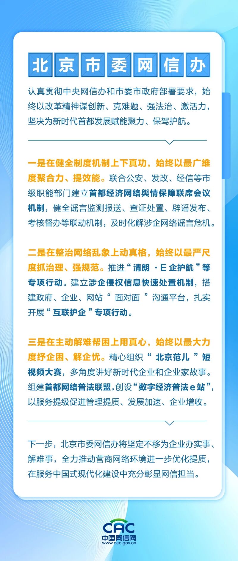 优化营商网络环境是优化营商环境的重要内容,也是网信部门的重要职责。近日,中央网信办在北京召开优化营商网络环境工作经验总结交流会。围绕优化营商网络环境工作,北京、上海、福建、四川等地网信办,以及微博、腾讯、抖音等平台,探索形成了一批好经验好做法。现将有关发言摘编如下,以供交流。