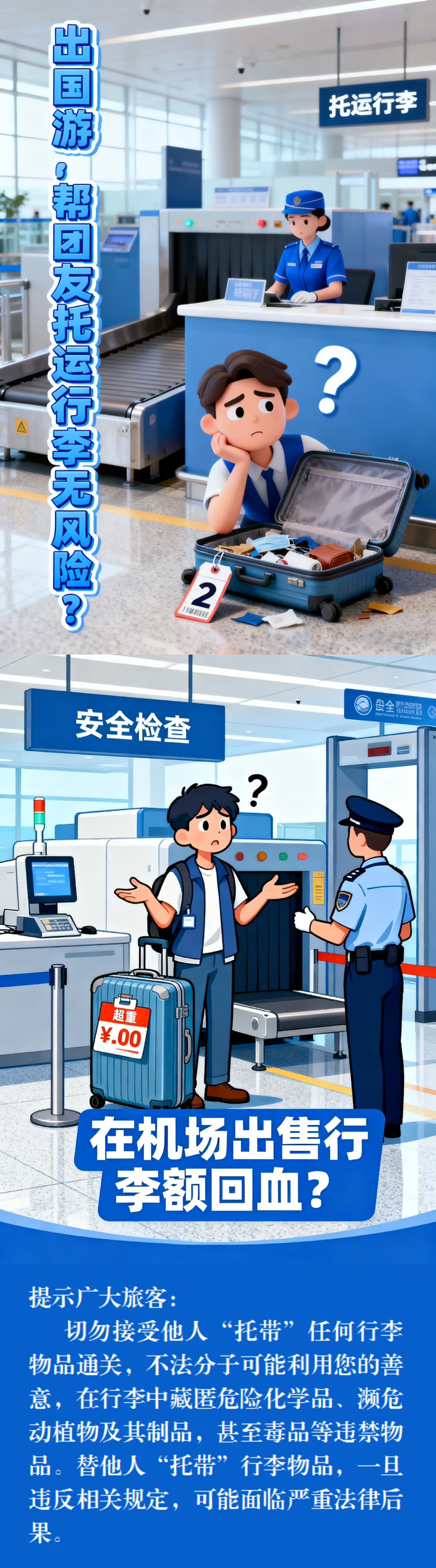 作品简介:作品聚焦旅客进出境时可能遇到的“帮团友托运行李物品”“出售行李额回血”谣言和风险,通过场景化呈现,揭露不实信息的本质,警示切勿因一时善意或小利,影响个人出行甚至承担法律后果,助力旅客安全出行。