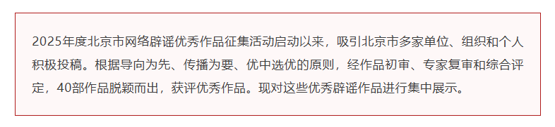 账号简介:专题立足市属媒体定位,致力于打击谣言、传递真相、澄清谬误、明辨是非。重点关注民生热点、政策发布和科学科普等领域常见谣言误区、误解误读,通过图文、海报、短视频等多种轻量、快捷形式,及时发布辟谣信息、传递权威声音、引导网络舆论。年内共发布辟谣提示稿件2247篇,全网阅读量超100万,取的较好传播效果。