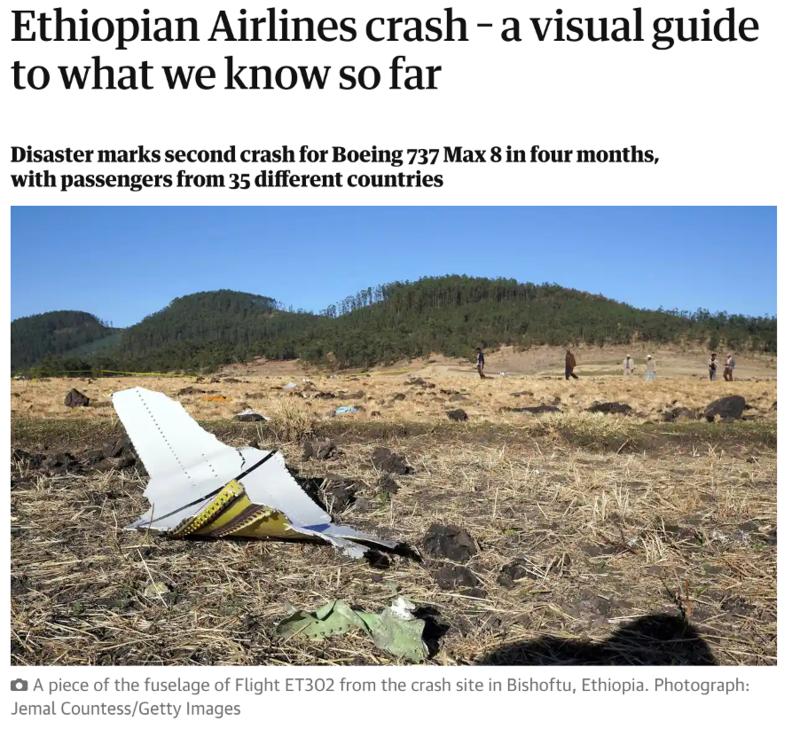 据《卫报》报道,当地时间2019年3月11日,埃塞俄比亚航空ET302客机在亚的斯亚贝巴机场附近的比绍图镇(Bishoftu)坠毁,机上157人全部遇难。事故发生时,ET302正在执行亚的斯亚贝巴-内罗毕的飞行任务。