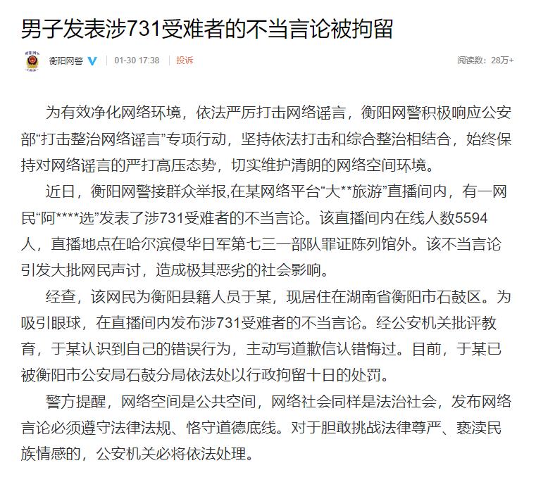 经查,该网民为衡阳县籍人员于某,现居住在湖南省衡阳市石鼓区。为吸引眼球,在直播间内发布涉731受难者的不当言论。经公安机关批评教育,于某认识到自己的错误行为,主动写道歉信认错悔过。目前,于某已被衡阳市公安局石鼓分局依法处以行政拘留十日的处罚。