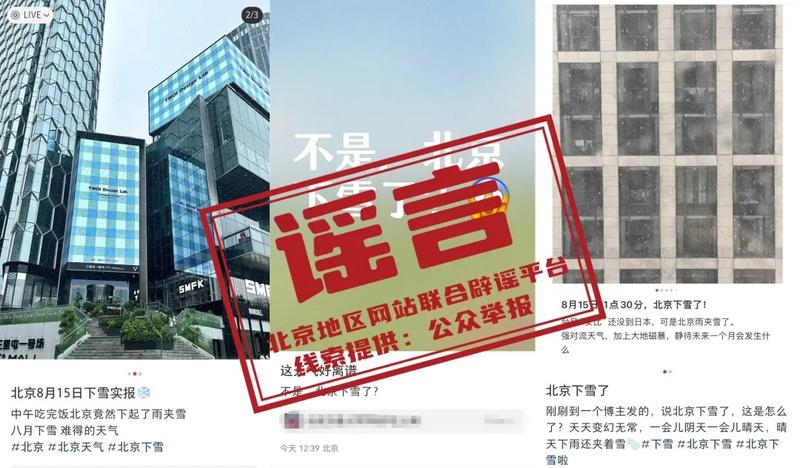 8月15日,有多名网友在社交平台发帖称“北京下雪了”,并配发图片、视频。
