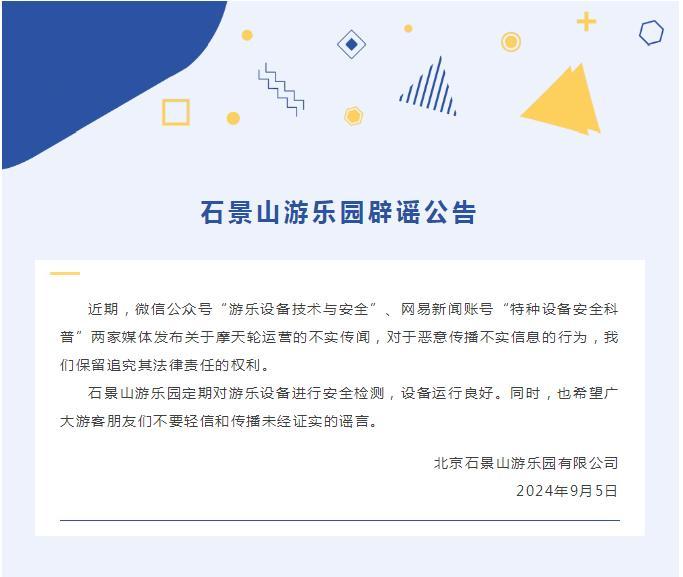 对此,石景山游乐园发布公告称:石景山游乐园定期对游乐设备进行安全检测,设备运行良好。对于恶意传播不实信息的行为,石景山游乐园保留追究其法律责任的权利。同时,也希望广大游客朋友们不要轻信和传播未经证实的谣言。