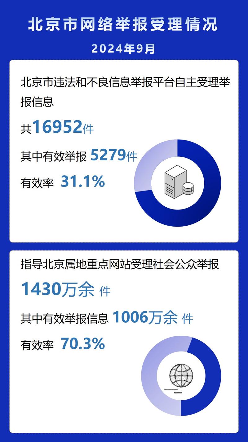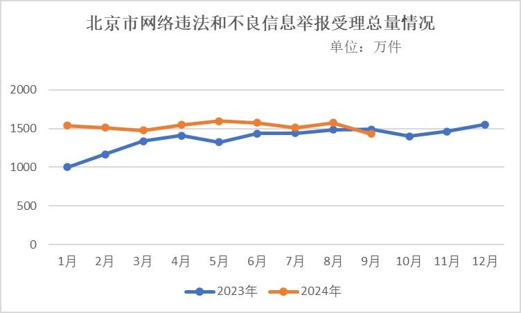 北京市违法和不良信息举报平台2024年9月,北京市违法和不良信息举报平台和属地重点网站共受理网民举报色情、赌博、侵权等违法和不良信息1431万余件,环比下降9.1%、同比下降4%。