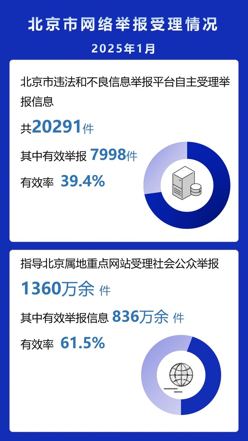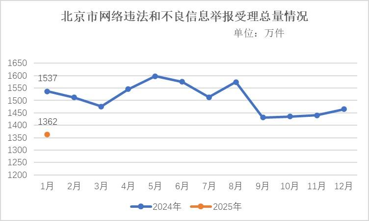 2025年1月,北京市违法和不良信息举报平台和属地重点网站共受理网民举报色情、赌博、侵权等违法和不良信息1362万余件,环比下降7.0%、同比下降11.4%。