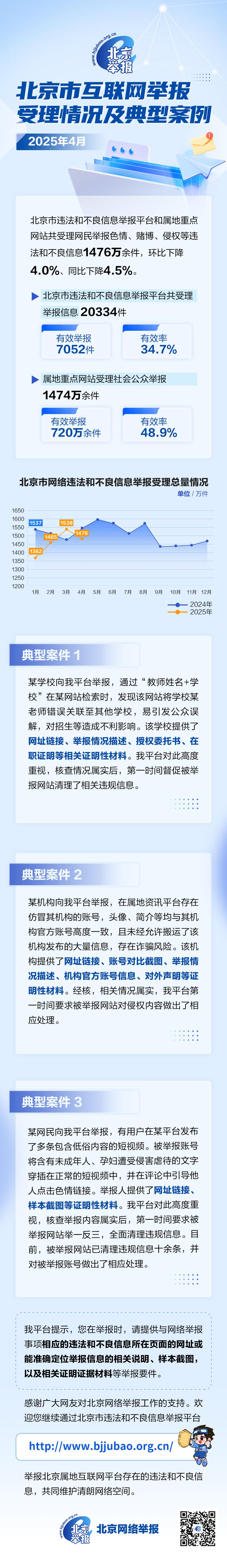 北京市违法和不良信息举报平台2025年4月,北京市违法和不良信息举报平台和属地重点网站共受理网民举报色情、赌博、侵权等违法和不良信息1476万余件,环比下降4.0%、同比下降4.5%。