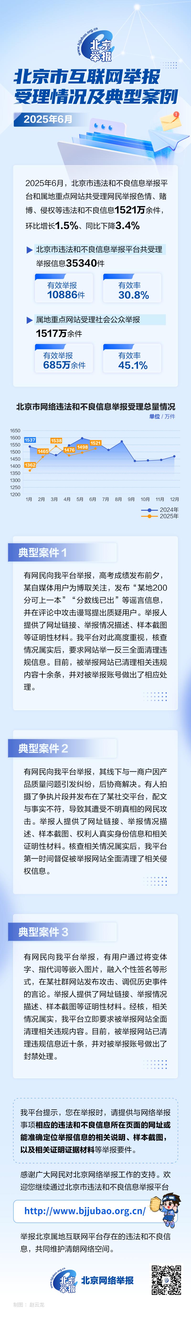 北京市违法和不良信息举报平台2025年6月,北京市违法和不良信息举报平台和属地重点网站共受理网民举报色情、赌博、侵权等违法和不良信息1521万余件,环比增长1.5%、同比下降3.4%。