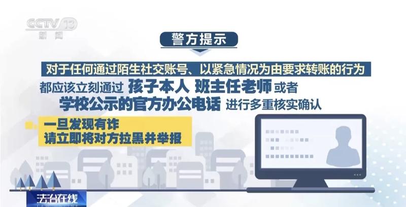 同时对于任何通过陌生社交账号、以紧急情况为由要求转账的行为,都应该立刻通过孩子本人、班主任老师或者学校公示的官方办公电话进行多重核实确认,一旦发现有诈,请立即将对方拉黑并举报。