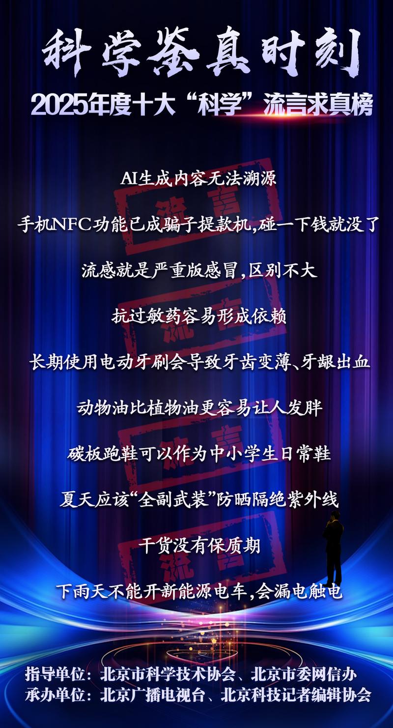 北京市违法和不良信息举报平台12月31日,“科学鉴真时刻——2025年度十大‘科学’流言求真榜”在京发布。该活动由北京市科学技术协会、北京市委网信办指导,北京广播电视台、北京科技记者编辑协会承办。现场特邀权威专家组成科普团队,针对网络热议的年度十大“科学”流言进行深度剖析与辟谣,助力公众提升信息甄别能力。
