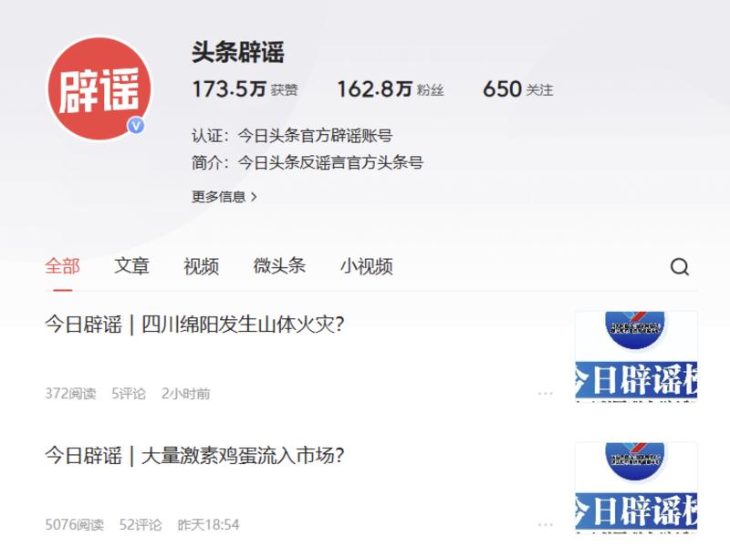 账号简介:作为今日头条反谣言官方账号,开设“今日辟谣”“头条辟谣周榜”“北京辟谣”等专栏,从不同时段、不同地区等进行辟谣传播,同时对热点话题进行专题辟谣,力求通过辟谣账号发布内容传递正确信息、传播反谣言观点和方法,进一步提高网民识辨谣言的意识和能力