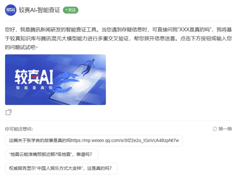 专题简介:谣言止于智者,更止于工具。基于腾讯较真事实查证经验与百万级辟谣数据库,腾讯新闻于2025年创新推出AI驱动的智能事实查证工具“较真AI”。以AI技术赋能谣言治理,用实时查证对抗信息沼泽,通过升级动态推理系统,助力网民实时追踪查证逻辑;联动权威机构、专家库与AI交叉验证,形成“人机协同”辟谣网络;实时风险提示与可信度评分,赋能网民养成“质疑-验证”的思维模式。