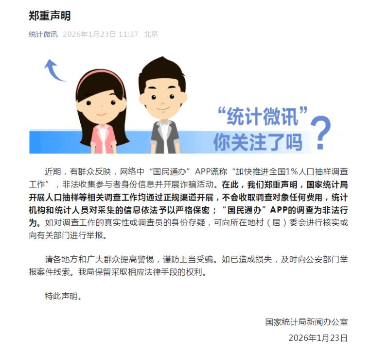 北京市违法和不良信息举报平台1月23日,国家统计局新闻办公室在“统计微讯”公众号上就近期网络上“‘国民通办’APP开展人口抽样调查工作”一事发布郑重声明,全文如下——