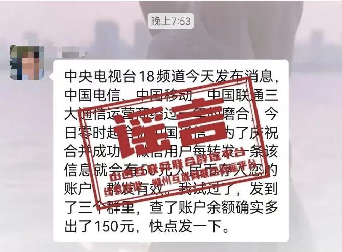 北京市违法和不良信息举报平台近日,一则“中央电视台18频道今天发布消息,中国电信,中国移动,中国联通三大通信运营商经过一年的磨合,今日零时起合称中国通信。为了庆祝合并成功,微信用户每转发一条该信息就会有50元人民币存入您的账户,群发有效。我试过了,发到了三个群里,查了账户余额确实多出了150元,快点发一下。”的消息在山西省朔州市多个微信群热传。经核实,该消息纯属谣言,请广大网民切勿轻信、切勿转发。
